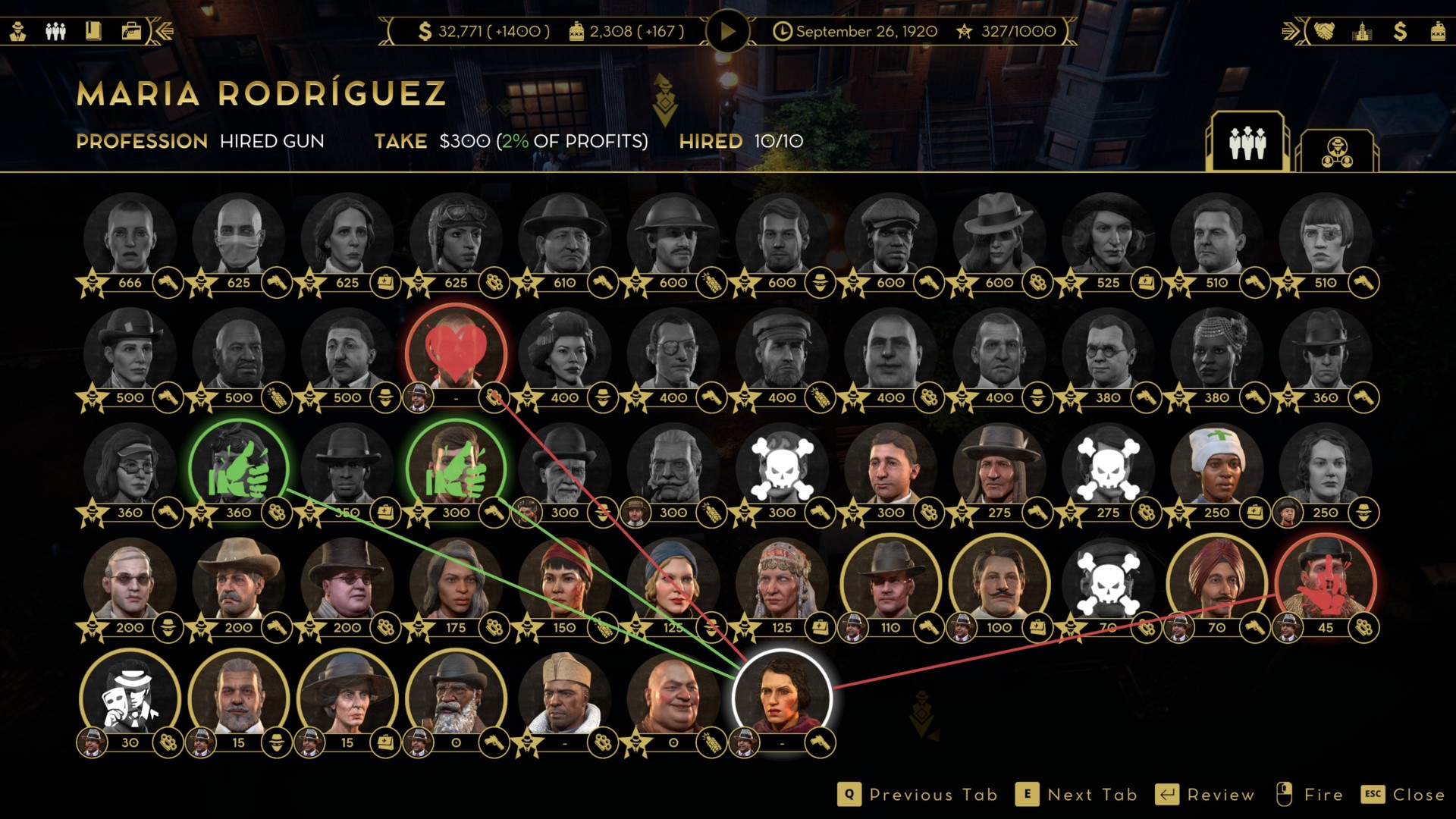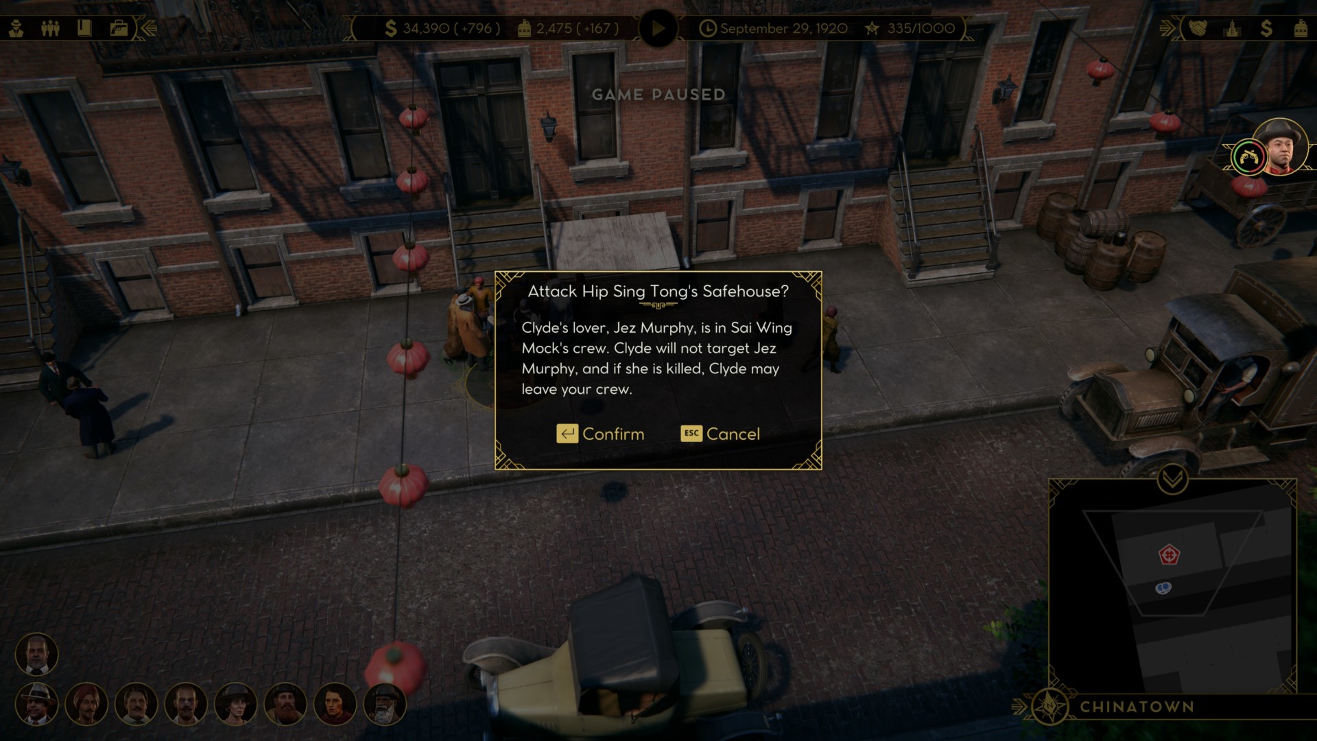Now, if they have a lover (a heart symbol) or friend (green thumbs up), this is where Empire of Sin goes from “that’s a neat feature” to “this looks like it wasn’t tested properly.” The issue occurs when a character’s lover or friend has been hired by a rival faction. Your hired gun won’t attack that character. But, if said character is killed, there’s a 50/50 chance that your underlings would leave your crew. As far as I know, there’s no way to “poach” someone off another crime lord. As such, you might need to reload a few saves prior to these battles if you want to have RNG in your favor.