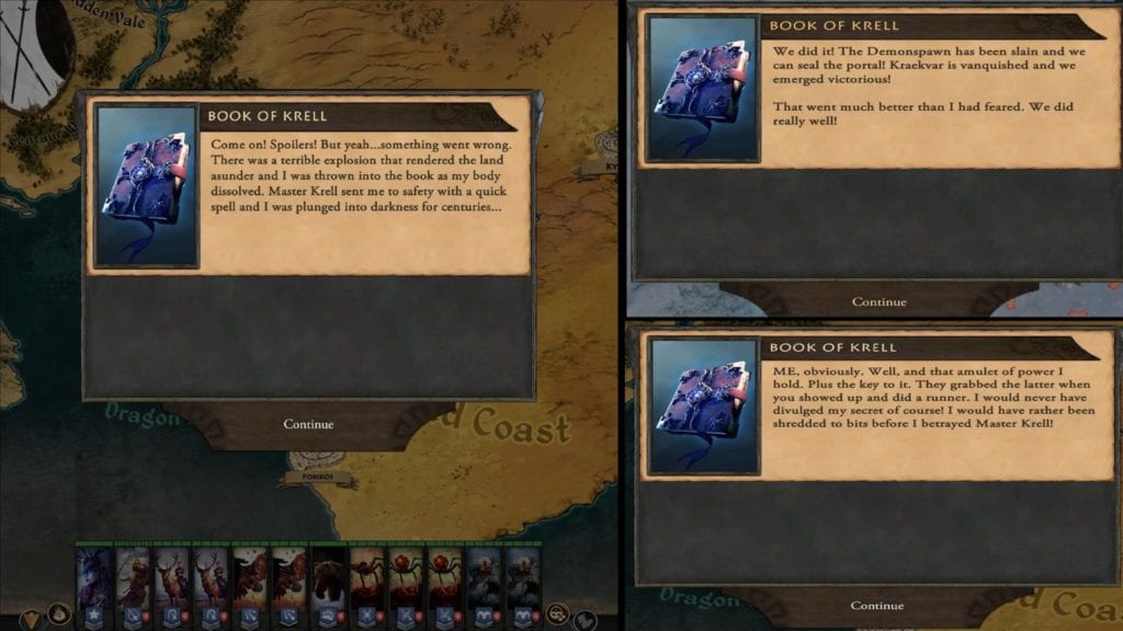 After selecting a hero to lead your forces, you’ll be tasked with finding the Book of Krell. There’s not much of a story here and you’re free to ignore the narrative. However, do pay attention to obtainable items or resources depending on each chapter’s mission that you choose.