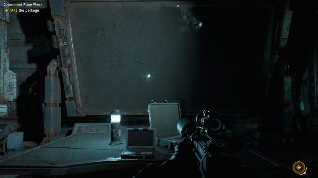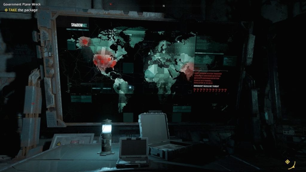More than that: the government plane wreck is actually the wreck of the Paladin, the cargo plane Fisher and co. used as a mobile base of operations in Splinter Cell: Blacklist, and that game’s hub location. This becomes very clear when you use the laptop pictured below, located in the section to which I’ve directed you.