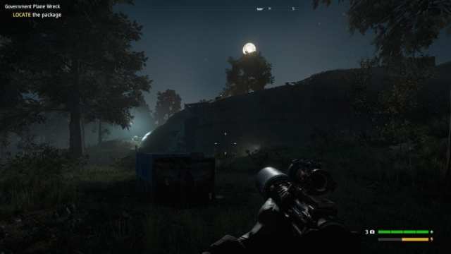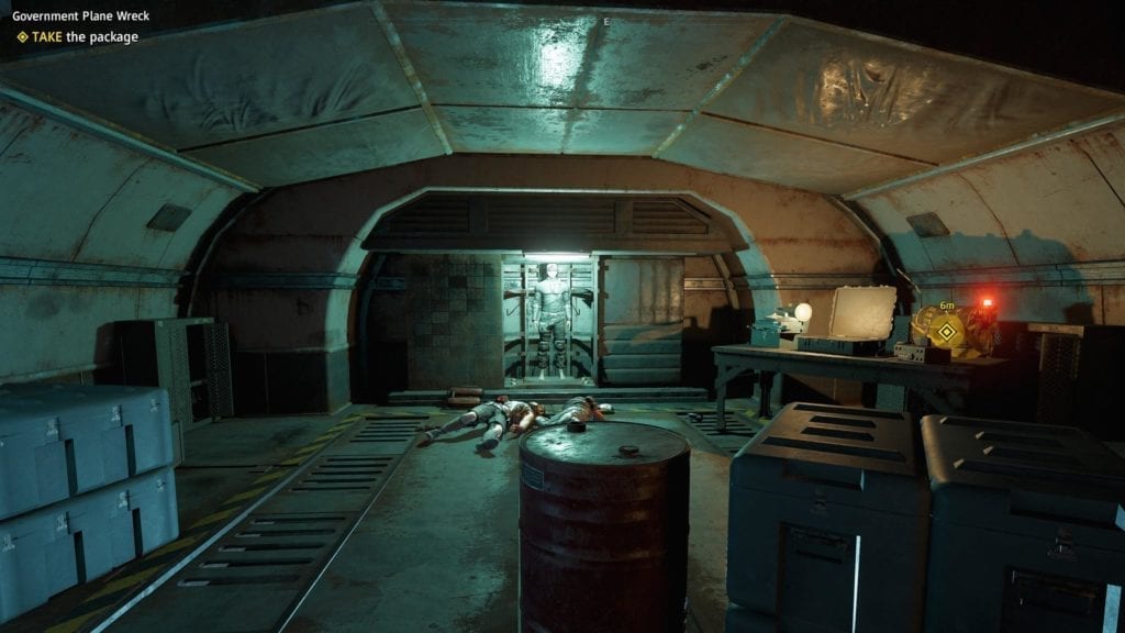 Once you land, you want to make your way to a very particular section of the plane depicted above. The nose, I believe, although it can be hard to tell because I’m bad at planes. Note that this may or may not be the location of the package you have to retrieve: I found this on my second run at the Government Plane Wreck, and the package was there this time. The first time it was in an entirely different location. Either way, expect hostiles.