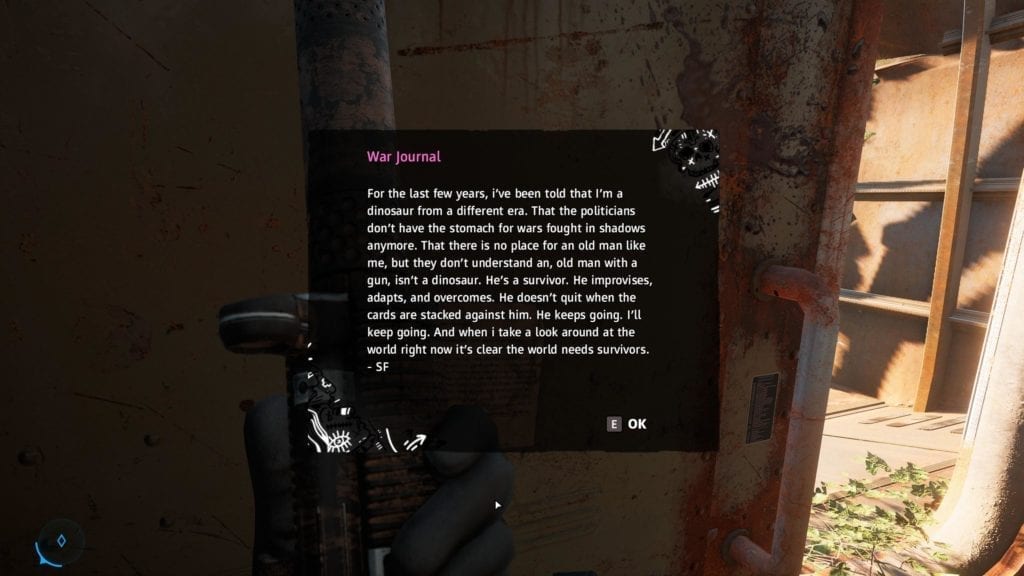 All around this expedition you’ll find notes from some chap called SF, who definitely isn’t Sam Fisher of Splinter Cell fame. These notes discuss the fall of various US cities; mention a stolen nuke being in Montana; and contain some talk about Briggs, Grim, and Kobin, as well as the mysterious SF trying to find an escape route for his or her daughter. Wait. Okay, no, SF is definitely Sam Fisher.