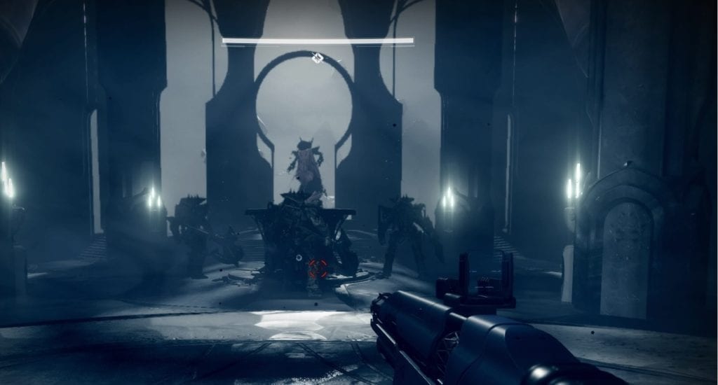 She’s surrounded by three sword knights reminiscent of Alak-hul, the Darkblade in Destiny 1. You do NOT want to get hit by these guys. If regular mobs hit like a truck, then these guys hit like a train! I actually saw my poor 598 PL/3 Resilience Warlock get one-shot while standing on a Well of Radiance, believe it or not!