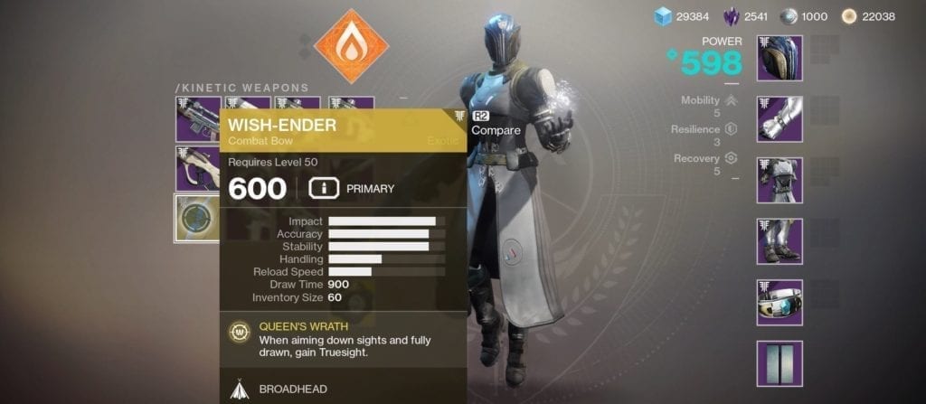 The Wish Ender has a couple of unique perks. The first is Queen’s Wrath, which gives you Truesight (wallhacks) when you’ve fully drawn the bow and are aiming-down-sights. The second is Broadhead, which allows its shots to pierce through multiple targets. To be honest, I’m not much of a fan of it. I like it for the sake of adding it to my collection and the overall challenge. It was also a major disappointment since its perk, Broadhead, was bugged. Other exotics like the Sleeper and Whisper completely trumped it in terms of usefulness.