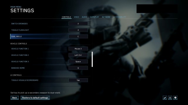 Again, there are no major changes here until we look at the keybindings. This is where you’ll notice the dual-wielding action that’s introduced in the game. The Arbiter’s cloak is also bound to the flashlight button (default “4”) though it’s not mentioned in the settings.