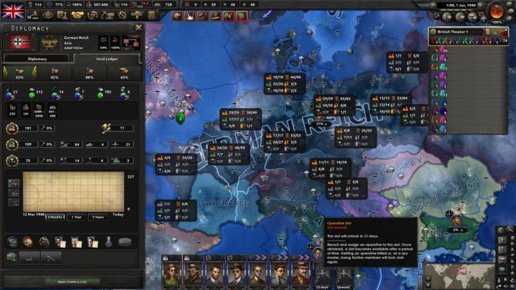 That’s for most other nations. If you’re playing as Britain, however, then the sky’s the limit. This is due to the way Hearts of Iron IV: La Resistance lets countries recruit operatives. Most of your spies will come from becoming a spymaster (limited to faction leaders) and waiting for others to join your faction. Basically, once Germany steamrolls other European countries, Britain (as the spymaster of the Allies) gets more spies.