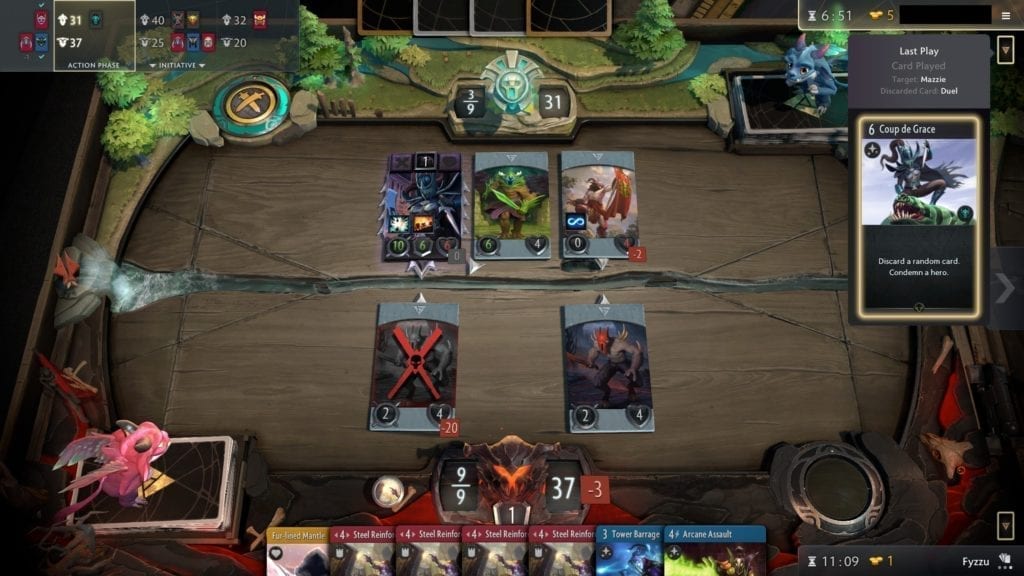 Each of these three lanes effectively functions as a completely unique playfield, with cards played on one lane unable to affect other lanes. This isn’t strictly true – as with most CCGs (and Dota 2 itself), a lot of the fun comes from cards that bend or break the general rules – but it’s a good rule of thumb.
