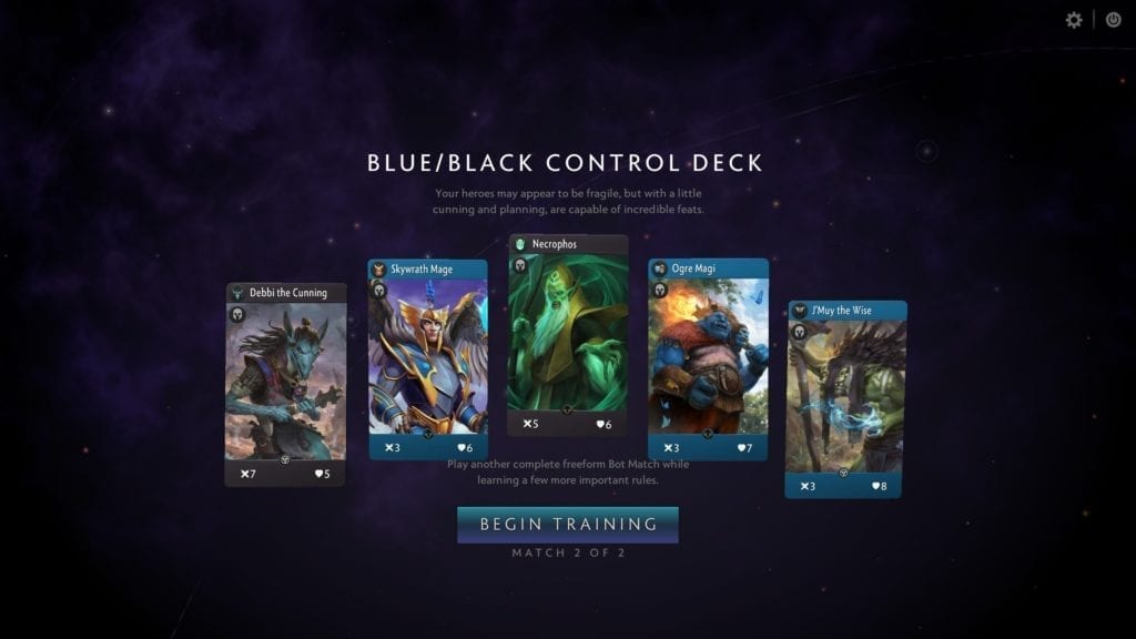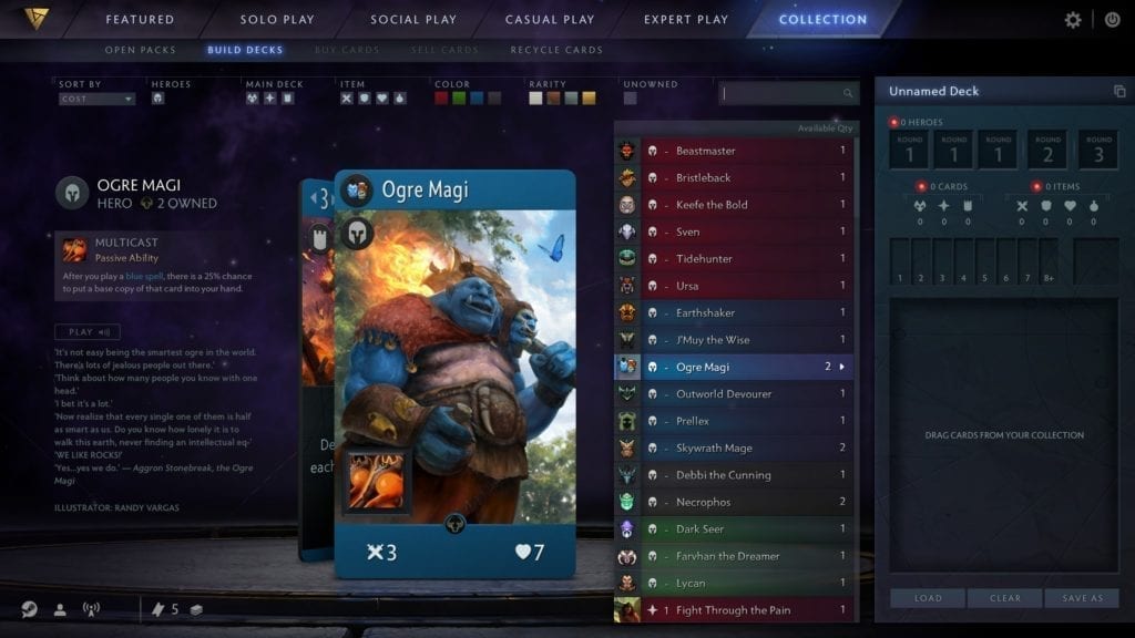 Heroes have quirks that make them distinct from other cards. First, each one comes with Signature Cards. Adding the hero to your deck also adds these cards to your deck, representing one of the hero’s signature abilities from Dota 2. For example, Skywrath Mage adds three Mystic Flare cards to your deck, which inflicts 12 damage split evenly between a targeted enemy and its neighbors