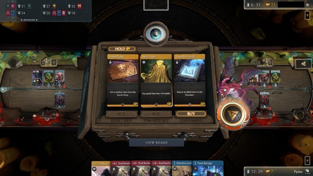 First up, you get the opportunity to spend your gold. Three items are made available: things from your item deck (a separate set of cards you set up for your deck), consumables like Healing Salves and Town Portal Scrolls, and the Secret Shop, which has a single random – and usually powerful – item up for sale at a high price. You can choose to spend one gold to “hold” the Secret Shop item until the next shopping phase if you so desire.