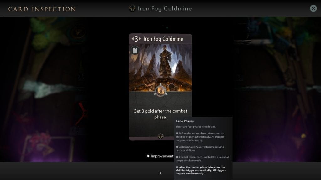 Improvements can be best described as lane-specific buffs (although, as with everything else, there are certain Improvements that can impact other lanes). Some might inflict damage on the enemy tower at the start of each turn, or hit a random enemy unit at the start of each turn, or boost that lane’s mana pool permanently. Maybe they automatically create a Melee Creep every turn or boost the Armor of every friendly unit there. Improvements are many and varied, have a lot of possible applications, and require specific cards to get rid of. But once they’re placed, you can’t shift them into another lane later.