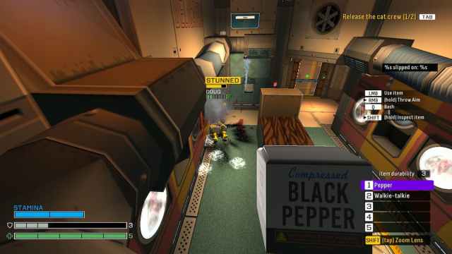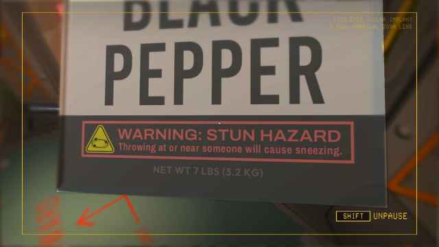 I couldn’t find the fuse box for vents yet, so those were inaccessible to me. Instead, I approached the Black Pepper machine, which gave me a pack of Black Pepper, as expected. Zooming into the black pepper confirmed that throwing it at enemies stuns them and causes them to sneeze.