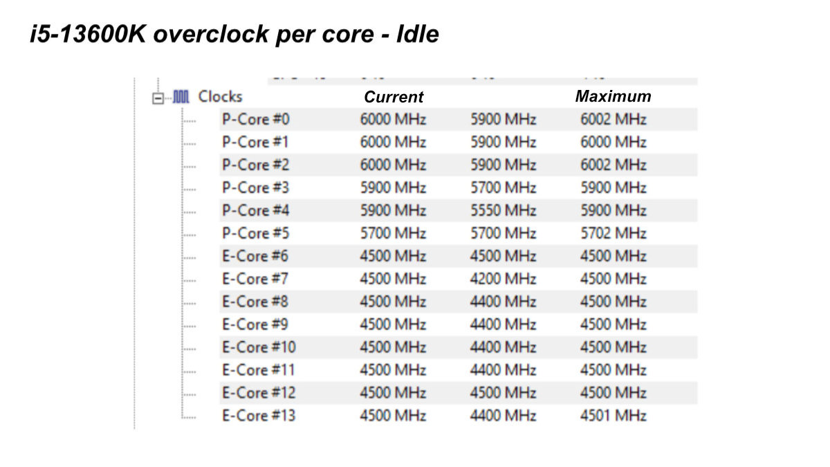 The 13600K overclocked to 6.0GHz on three P-Cores at idle and remained stable at 5.7GHz while running games. That’s a 600+ MHz jump over the stock max frequency, and under load at that. i9-class frequencies are achievable with a proper overclock
