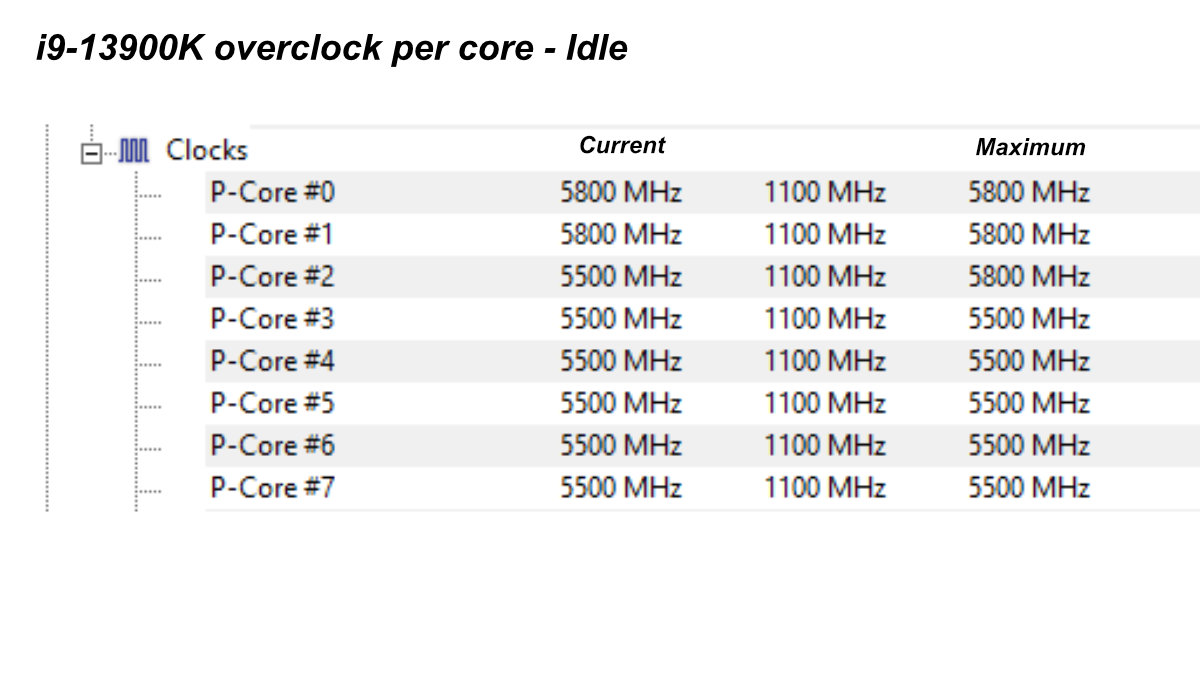 Overclocking potential is entirely different for the 13900K. The main difference we were able to achieve was a near-locked 5.8GHz at idle on three P-Cores. The frequency behavior was far more sporadic at stock Intel settings, often dropping to 5.5 GHz. Under gaming loads, the overclocked P-Cores immediately dropped down into the 5.5-5.6GHz range the same as stock.