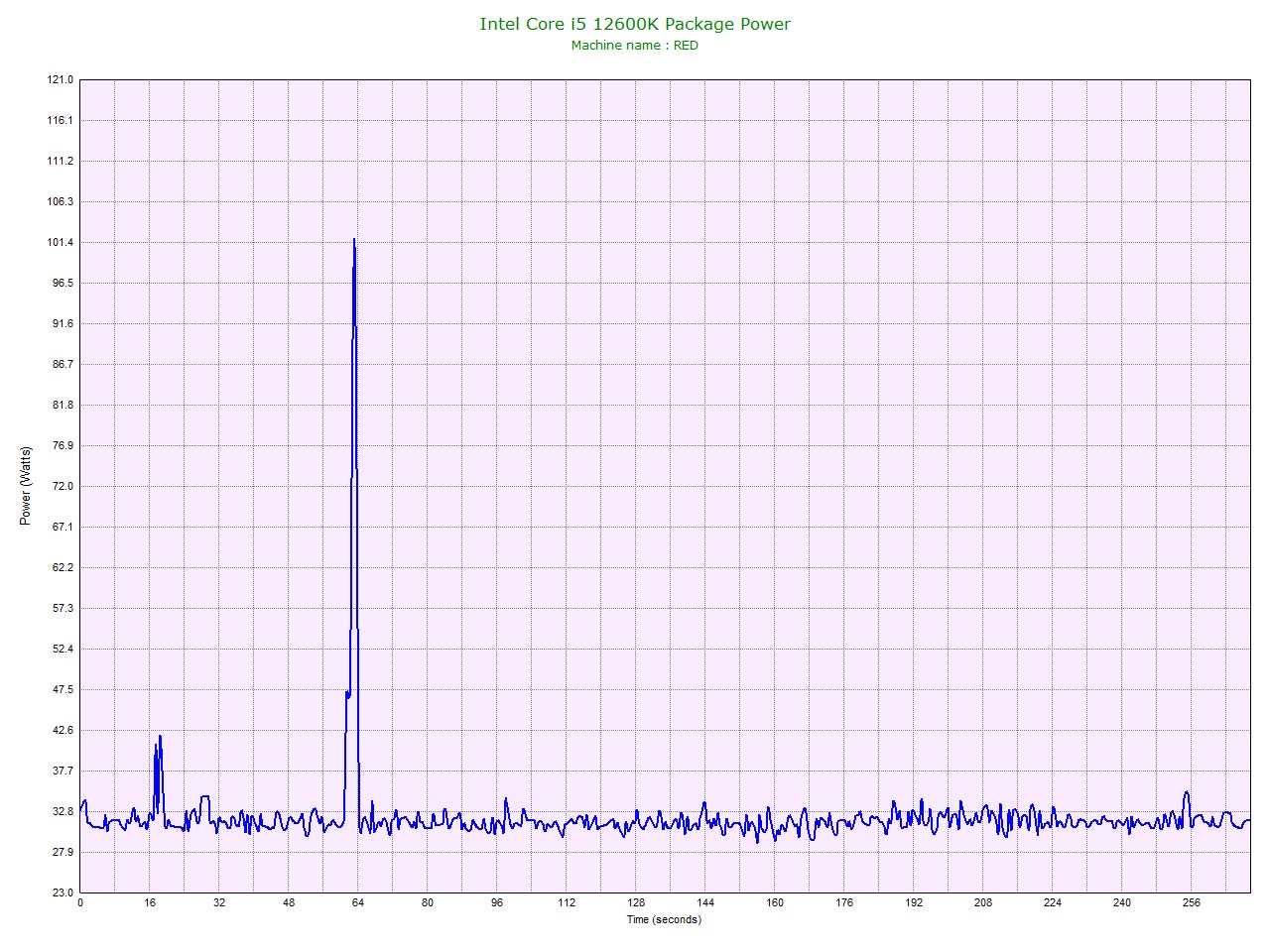 Before we get to the game data, here is what to expect out of the 12600K at idle on Windows 11. The processor averaged roughly 32W with all power consumption preferences set to maximum. As is shown below, power consumption did spike significantly during our test. We tracked this down to the anti-malware executable built into Windows, but still felt it important to include.