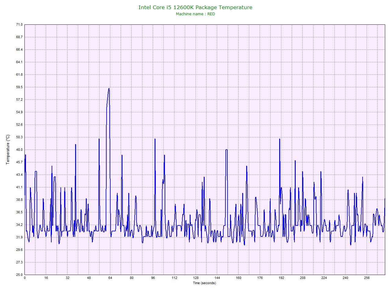 Here’s how the 12600K temperatures stand up to gaming while under additional load from other applications. We performed our same multi-tasking test described in the power consumption section to gather the data.
