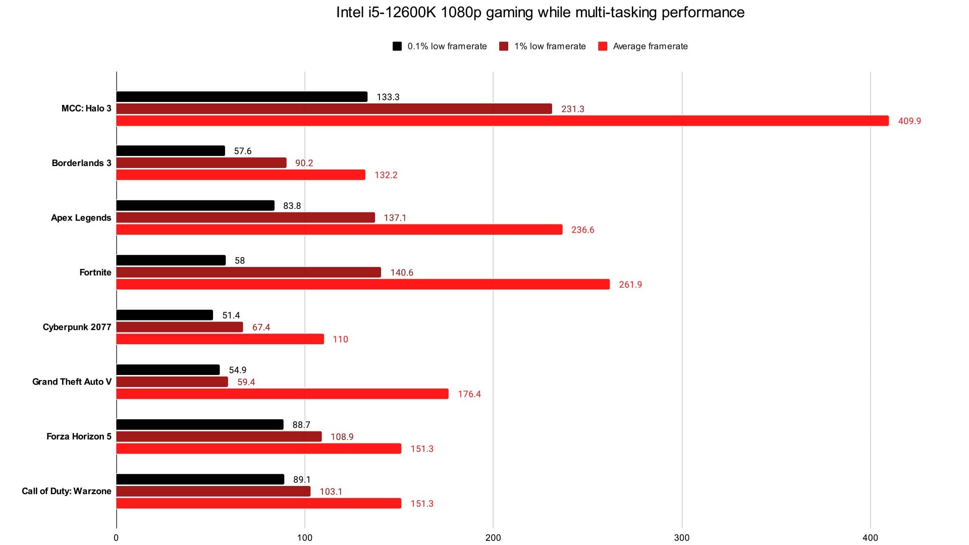 We ran these benchmarks based on the same multi-tasking conditions we previously tested with for power consumption and temperatures. The 12600K did take a noticeable hit in framerates, but managed to maintain overall healthy average framerates. The things players will notice most is worse 0.1% and 1% lows, which will result in games feeling a little less smooth and responsive.