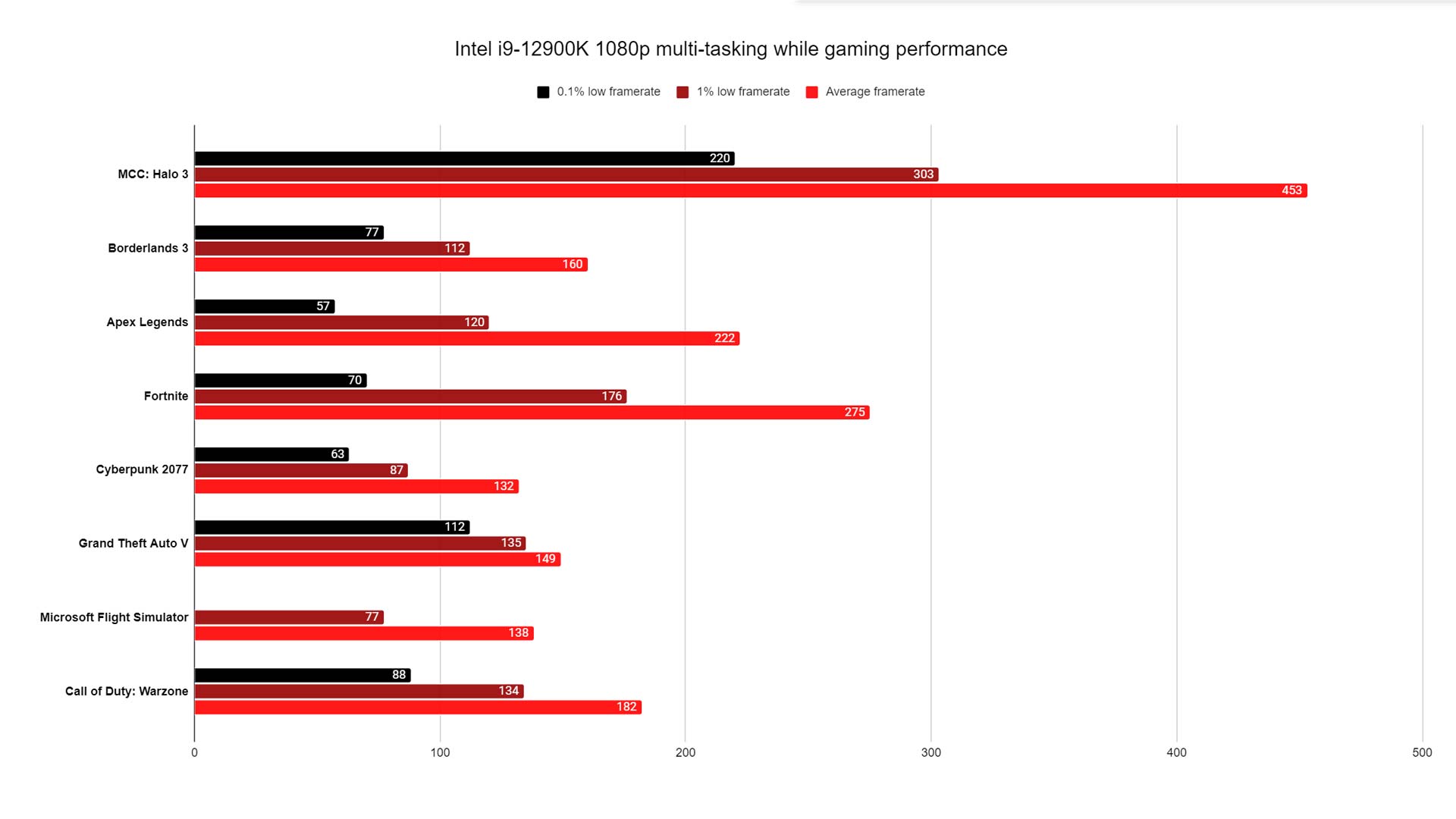 Based on the same multi-tasking conditions we previously tested with, it’s obvious the i9-12900K still took a hit in framerates in some games while handling additional tasks. Games like Cyberpunk 2077, Fortnite, Grand Theft Auto V, and Borderlands 3 exhibited noticeable drops in average framerates and 0.1% lows. However, some titles like Call of Duty: Warzone and Halo 3 performed relatively the same compared to standard gaming results. Still, these results are all easily playable and just outright impressive in some of the titles. Considering we used to need dedicated streaming PCs and/or capture cards just a few short years ago to game while simultaneously handling high quality gameplay capture and other processes without introducing massive stutters, there are clearly some big improvements going on here.