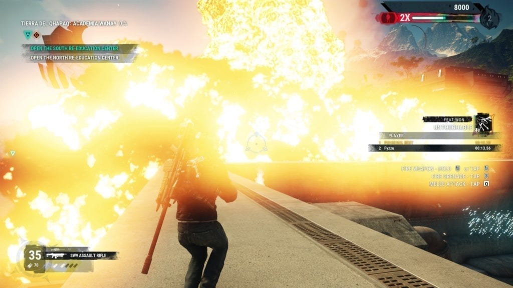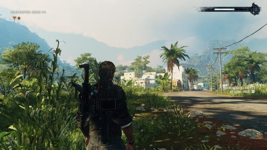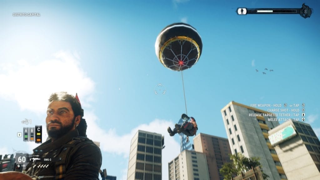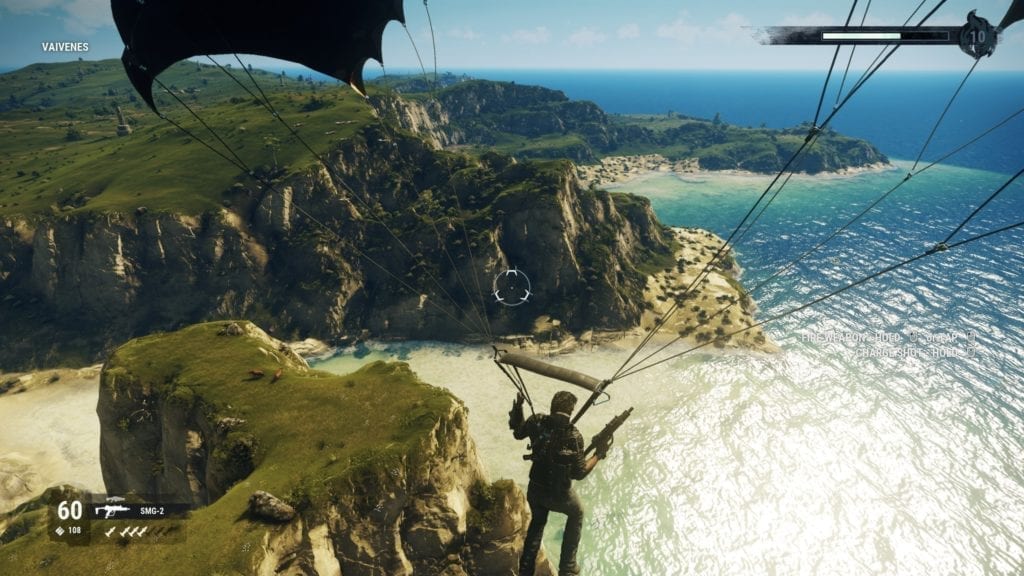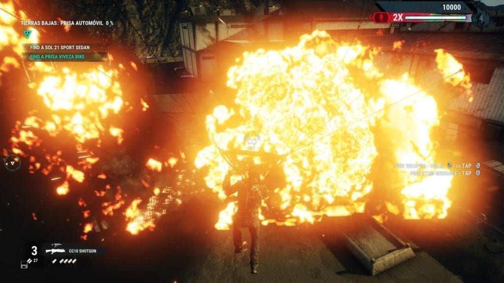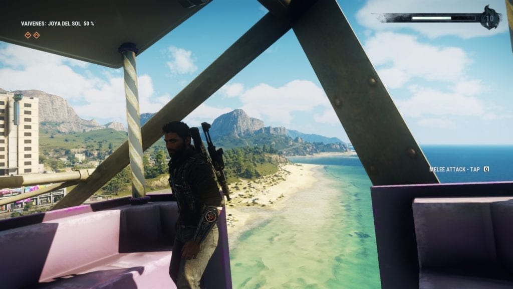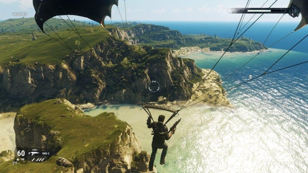 In gameplay, though, it’s all good. Some of the controls take some getting used to for newcomers to Just Cause – right-click is used for your grapple and tethers rather than for aiming, for instance – but these quirks are understandable considering the game’s focus. And, again, you can redefine them if you really want to. After 30 minutes or so, I didn’t feel the need to do so.