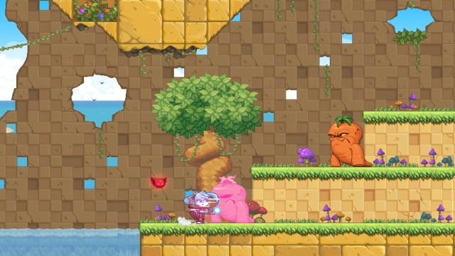 Suffice to say, there’s barely any plot. Cutscenes are infrequent and relegated solely to the beginning of the game and after boss battles. Defeating the final boss shows a different ending based on whether or not players have collected enough gems in each of the game’s levels, though. Due to the lack of narrative trappings, Kaze herself doesn’t have much personality. We don’t know anything about her other than that she’s a rabbit and she’s good at platforming and kicking the crap out of giant vegetables. This is fairly standard for a mascot platformer, but I do wish there was a bit more identity on display here.