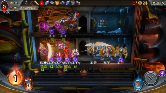 It works similarly with bosses, who are the last wave of attackers. They fight until they or every demon (or shark, candle man, whatever) on the level is dead, then freeze it over and move up. It’s generally inadvisable to let them reach the top. And don’t worry about frozen levels — they thaw for the next fight.