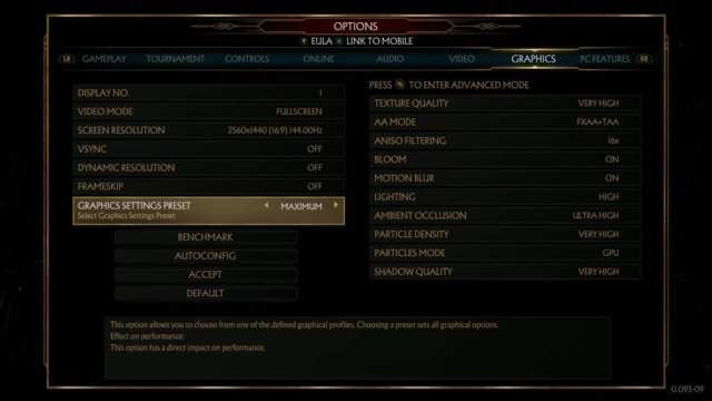 After running a series of benchmark tests, Mortal Kombat 11 unsurprisingly pushed all the graphics options to their maximum settings. My screen is set to 2560 x 1440 resolution with a 144Hz refresh rate and the v-sync feature turned off. However, my monitor does not support high dynamic range (HDR), so that remained turned off. Dynamic Resolution, which changes the game resolution to maximize frame rates, and Frameskip (which purposefully skips rendering frames to maintain 60 frames per second) are also turned off.