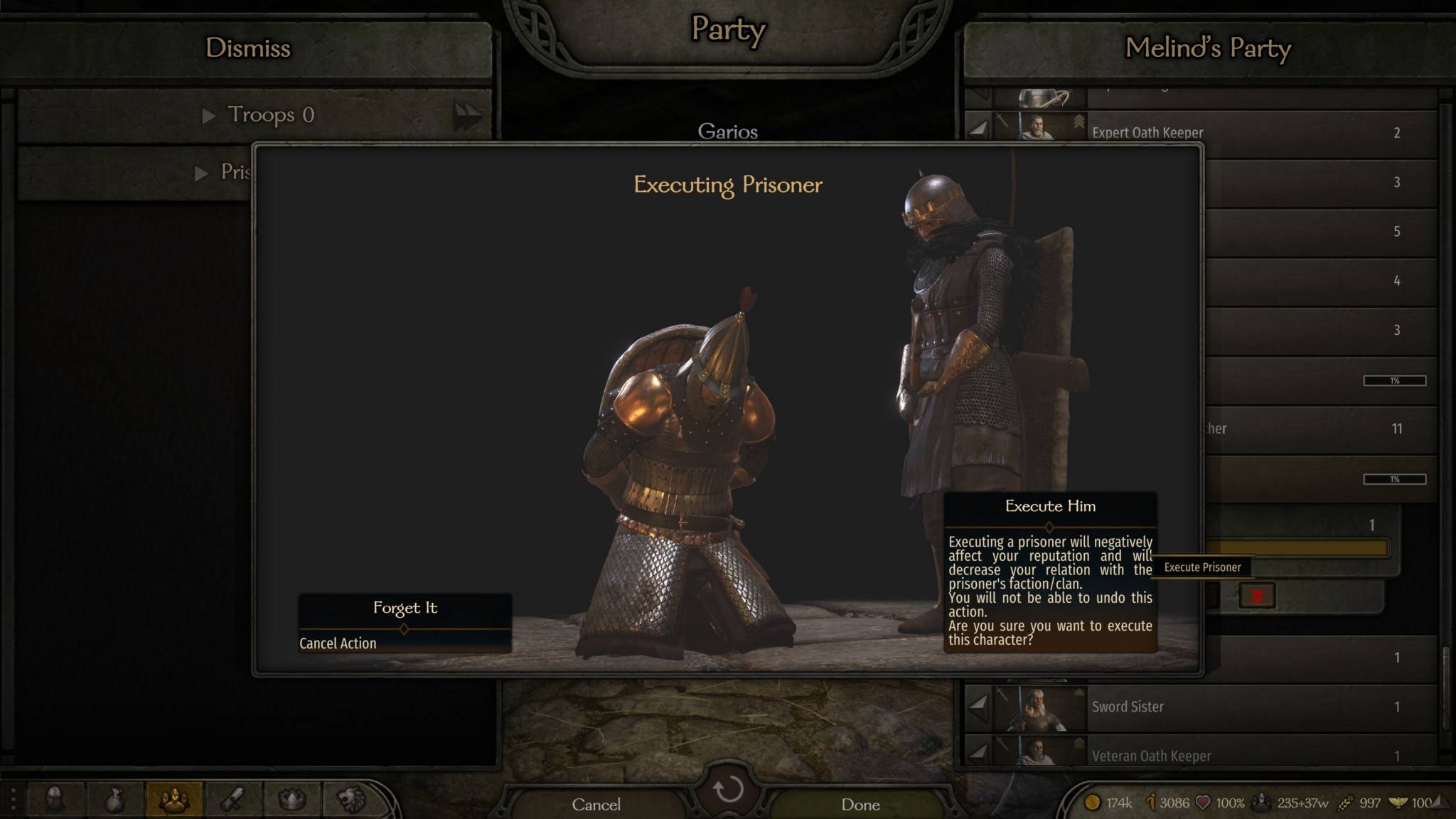 Here are more examples of why Bannerlord‘s diplomacy and dialogue systems are sorely lacking: You can’t get married to ally with your spouse’s liege, and even your partner doesn’t gain a relationship boost after marriage. The success of multiple-choice answers seems to be based purely on RNG rather than strength of perks and traits. You can’t tell King Derthert of Vlandia to stop roaming around with only 10 soldiers. You can’t pay a ransom for your imprisoned friend or capture a ruler to end a conflict. And you can donate some of your units to defend your allies’ garrisons, but they’ll end up taking everyone until the garrison has no more troops. Whoops!