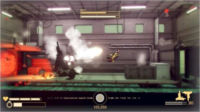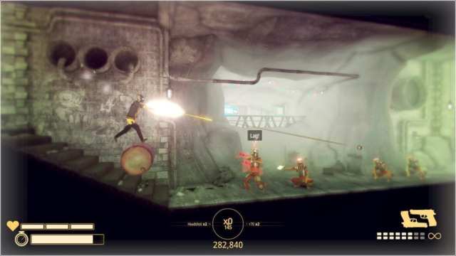 That impetus extends to the game’s environments and enemies as well. Each section is vastly different from one another. You run and gun through back-alley streets, office buildings, a moving train, and high-tech complexes. Every area houses adversaries that change in difficulty and, well, quirkiness. Naturally, you start off with the gun-toting gangsters, but soon you face mercenaries, seasoned professionals, and sewer-dwelling LARPers with medieval swords and armor.