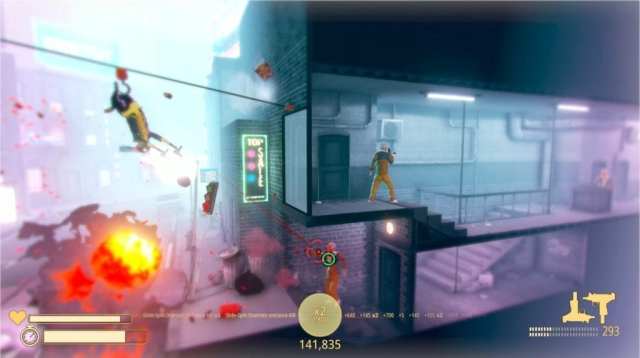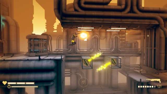 The game staves off repetition by constantly offering tools, tricks, and environmental challenges. Reflective panels appear later, allowing you to redirect bullets into enemies from a distance. At times you’ll also run across a frying pan that you can kick skyward, and shooting makes it comically bounce in the air as it reflects bullets at your foes. There are also barrels to ride and gas canisters you can blow up in mid-air, and you can even kick the severed heads of enemies into their comrades. Later, the game tests your platforming and wall-jumping skills by laying a series of electrified traps.