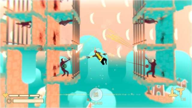 Of course, My Friend Pedro doesn’t waste time pondering the value of its primary mechanic. Instead, the game places you in the blood-caked shoes of a man keen to slaughter thousands of dudes at the bidding of a talking banana, Pedro, who may or may not be all in your head. You run through a grungy, 2D world mowing down enemies with a multitude of weapons. When foes stray too close, you can send them packing with a swift kick to the teeth.