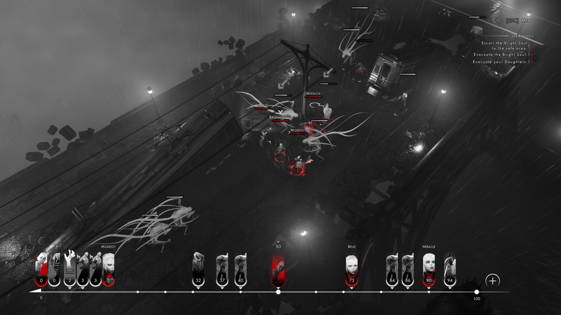 One example I distinctly remember was doing a random “Rescue” (VIP/escort) mission. In Othercide, you can expect a hellacious time because of small, cramped maps and a limited number of Daughters. Combine this with a few action points, the “burst” mechanic, and half a dozen enemies at the start followed by new reinforcements (sometimes four or five at a time, including some elite-types), and you might be overwhelmed. The game even spawns hostiles next to the evac point once your VIP (known as a Bright Soul) reaches it because why not?