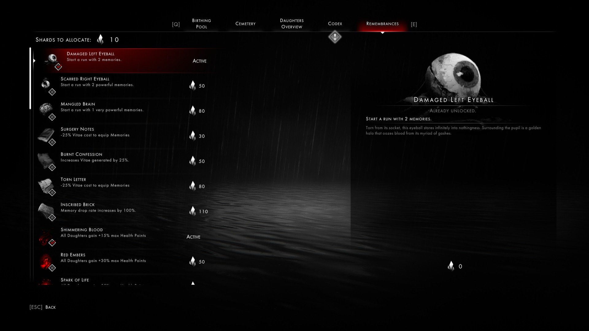 Now, if you’ve completed certain milestones (ie. deal a total of X damage or kill a total of Y enemies), you’ll unlock “Remembrances” which are perks that boost you throughout the campaign. Some might increase your XP gains while others provide tokens that resurrect dead Daughters.
