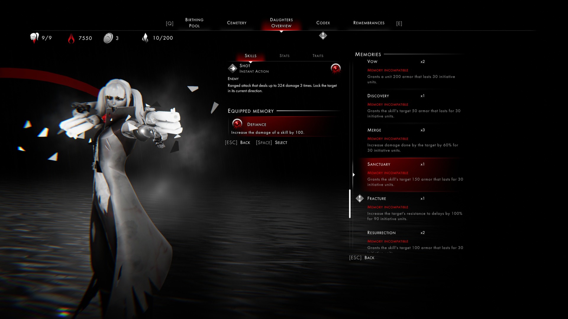 Daughters, as they level up, can be granted new skills (you’ve got two to choose from every five levels). These skills, in turn, can be slotted with “memories” or mods that increase their damage or add new effects such as armor reduction or initiative delay.