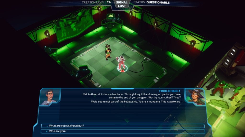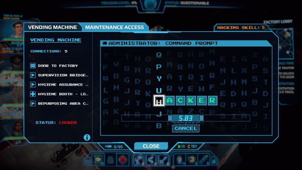 Paranoia has a hacking minigame — and it’s one of the worst hacking minigames I’ve ever seen. And let’s face it — there’s stiff competition in that category. It’s effectively Guitar Hero on an incredibly tight time limit, and you have to click the correct letters as they scroll down the screen into the box. Detection is iffy, and this uses limited resources. Screwing up hacking may require spending 5-10 minutes scouring the environment for more stuff you can break down into your hacking tools. And did I mention that the game only supports 720p or 1080p resolutions?