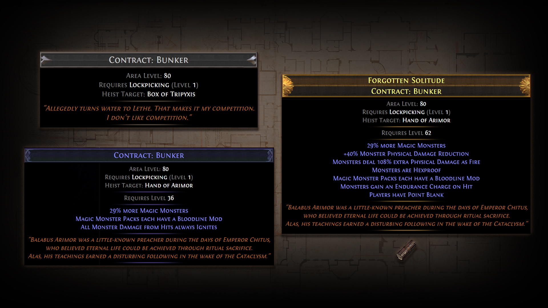 To start a heist, you’ll first need a contract (these also drop from monsters or heist completions just like markers). Additionally, crafting modifications with your regular currencies apply to contracts as well, and certain changes will increase the difficulty and rewards (seen below).