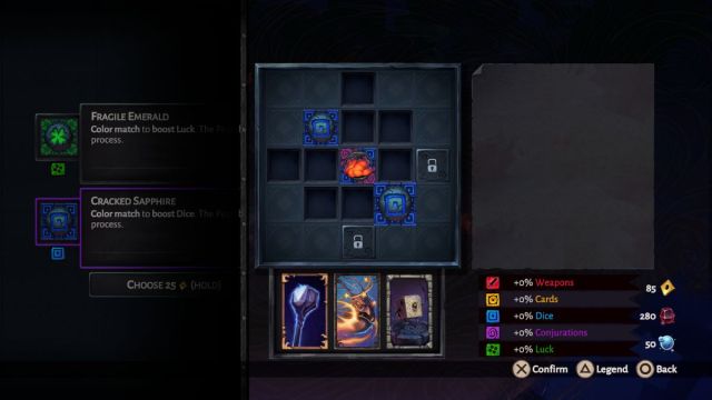 Finally, you also have a six-sided die you carry with you, named Fortune. You can toss fortune at enemies to deal damage based on the roll you get. It’s a really fun aspect. Your total arsenal consists of your card attack, basic attacks, charged attacks, and Fortune, so overall there’s a fair bit of variety. But all of this is impacted by your relics, as well.