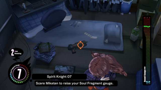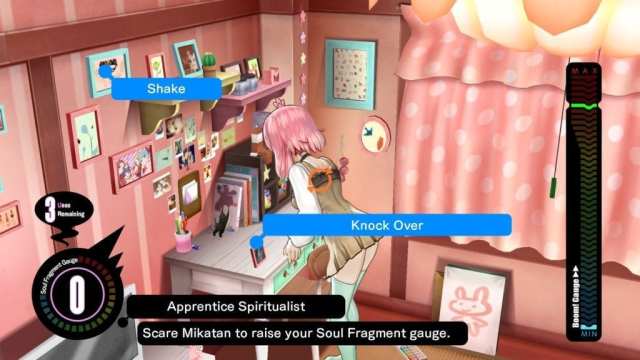 As Yuta is in spirit form, he can travel through walls and floors and go into the rooms of his housemates. At first, he only has very limited spirit abilities that allow him to freeze time and manipulate things. He needs to scare the others, which causes him to gain soul fragments, which allow him to level up. Once his spirit level is high enough, he then needs to set up a trick chain in order to achieve a goal. During trick segments, Yuta can choose which room to visit in whatever order he wants, which adds a bit of freedom.