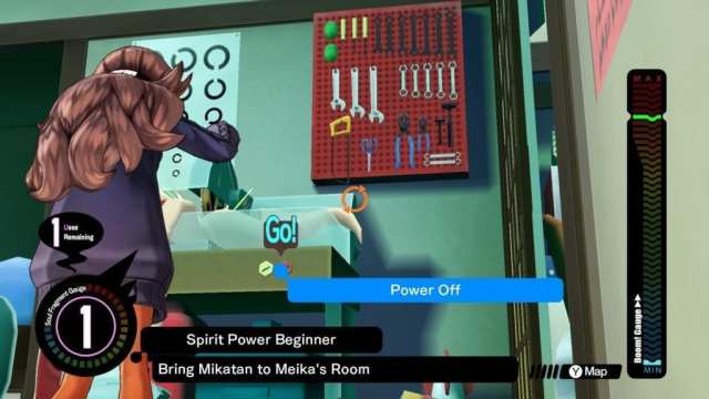 These are really simple and self-explanatory in the early part of Punch Line. Yuta can only use his spirit abilities a few times, however, and using them all without leveling up or successfully completing the chain will cause him to fail his mission. When he fails, a meteor destroys the entire planet. There’s a good reason for that, I promise. The main challenge in these segments is picking the right prompts, but it’s generally really obvious. For the chain segments, events are set in motion by selecting the prompt with the word “go” written above it.