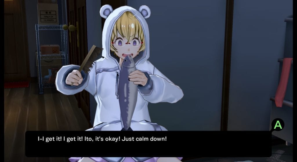 This is fairly similar in concept to the classic game Ghost Trick. An early chain requires Yuta to get his housemate Mikatan Narugino to find a key to open her locked desk drawer. The key is in the room of Meika Daihatsu, Korai House’s landlady. Each trick and trick chain are extremely basic gameplay-wise. You can’t move around freely, unfortunately. Instead, you get access to a few camera angles which allow you to look around the other rooms. Certain objects have a prompt next to them that Yuta can activate to scare the inhabitant or set up part of a chain.