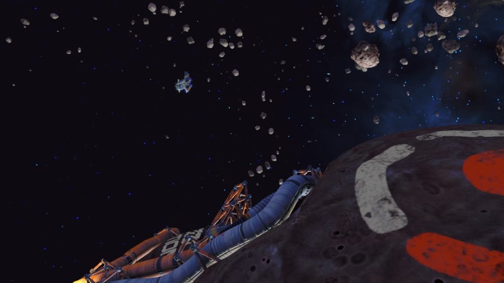 Now would be a good time to mention the game’s photo mode. At any time, you can pull up the command menu and pause the game. Then you can move freely and take pictures in a 3D environment around your own spacecraft as well as nearby spacecraft and space stations. This was where I noticed the depth of field most prominently. When viewing my spacecraft in the photo mode, it was obvious that the space station behind me was out of focus, whereas my spacecraft (the focal point) was in focus. Although subtle, this was detail was a nice addition.