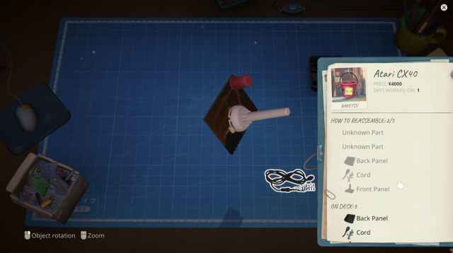 There are officially licensed Atari products in the game as well, such as the Atari CX40 joystick, which I cleaned and repaired by replacing its cable and button by extracting those from another joystick. You can also store parts from devices for later use if there is a possibility. It really does feel like a workspace with all the actions and utilities you’d expect.