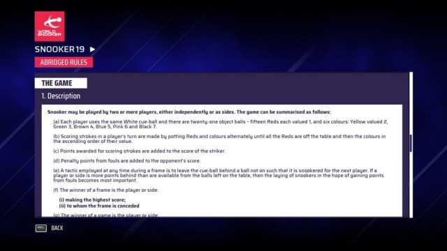 While the controls are a part of an interactive tutorial, the rules are explained in an ‘abridged’ guide that’s tucked away in the options menu. Despite being a shortened form, it includes 30 sub-headings, explaining the different aspects of the game. It’s great this guide is provided, but again, it’s all text. Plus, while the game introduces the core aspect of using the cue ball to shoot at the red and colored balls, it fails to mention deeper rules, such as fouls. Thus, I spent a lot of time during my initial few hours trying to figure out what not to do, as I was hit with fouls throughout.