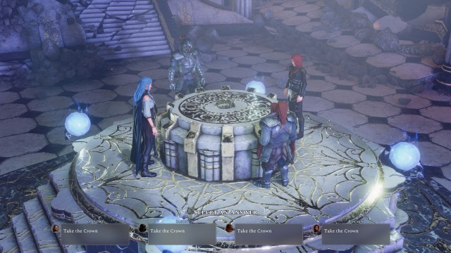 These reptilian conquerors are just your initial concern because something else catches your eye: a gleaming crown left on an altar. You then have a choice as to which character claims it. You simply can’t pass up on the chance.