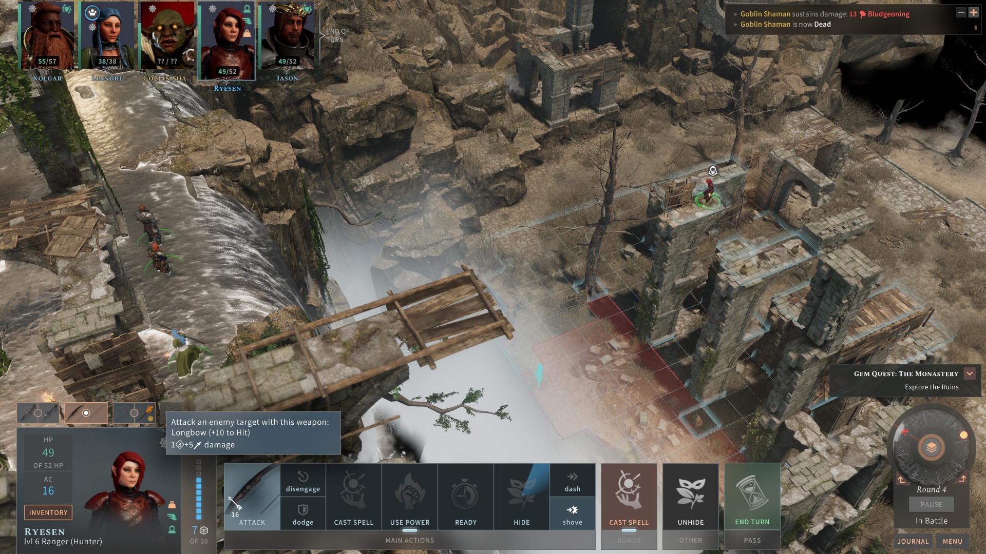 Perhaps one of the most memorable encounters I had was when I reached a gorgeous sight, a waterfall overlooking a monastery. I had my Ranger flying around while the cautious stance (sneak) was active until she reached the opposite side of the cliff. My three other characters along the waterfalls pelted hostile goblins with arrows, crossbow bolts, fireballs, and magic missiles. Meanwhile, my Ranger kept sneaking around to shove goblins off ledges. There are many setpiece moments like this, and there’s no denying that Solasta: Crown of the Magister gives you enough freedom to play the way you want to.