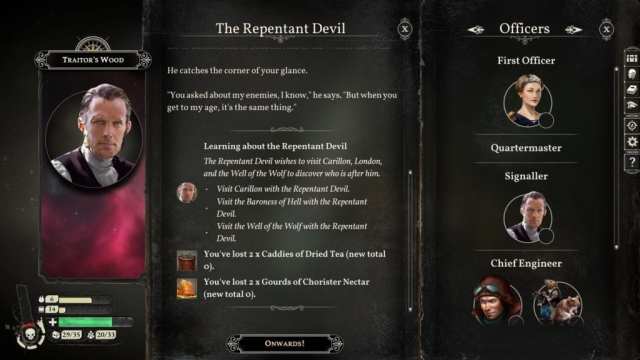 Some tasks would have you side between two warring factions, others to reunite twins from the circus. A task in Carillon may lead you to wickedly toy with those undergoing rites of penance, while one in Brabazon has you help out tired workers. You’ll even have quests to know more about the officers who’ve joined your vessel.