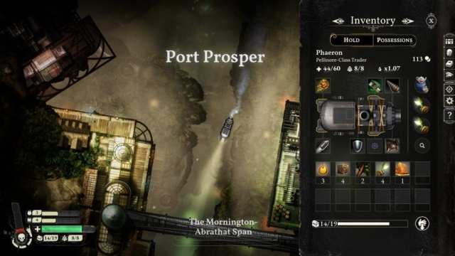 Most missions, especially ones concerning trade, require goods. Physical goods which you can find in various ports, wrecks, and hostile ships are stored in your hold (which has a limited but upgradable capacity). Metaphysical ones, however, don’t take up any inventory space. It’s a balancing act in figuring out how to manage your limited inventory space and where you need to go next.