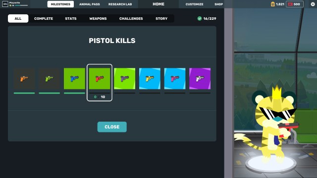 Battle royales typically have additional pursuits for players to chase, usually cosmetics of some kind. In Super Animal Royale, you have Milestones and the Research Lab. These are two different systems that allow you to work towards new animals, clothing, and weapon skins. And they never expire. You can always work on them.