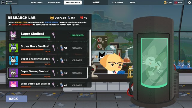 The Research Lab is where you unlock more murderously cute animals. Each match you play will reward you with Animal DNA for a specific animal type and Super Serum. Once you collect enough Serum and DNA for an animal type, you can create one of the skins in the family. These systems are excellent, because while you’re working on improving your aim, you’re working towards other things too. It’s a win-win.