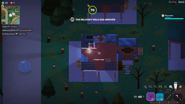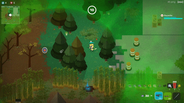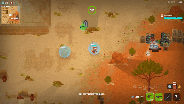 One of the most pleasing aspects of Super Animal Royale is that matches don’t take very long. The phases are short, and the gas circle closes quickly. However, moving at max speed with dodge rolls will allow you to mostly keep pace with the closing zone too — a good piece of game design. You can also use one of the game’s quirky vehicles — the hamster ball or giant emu — to really get rolling.