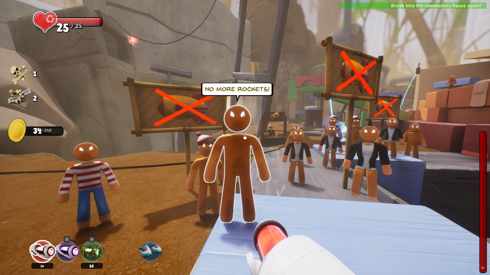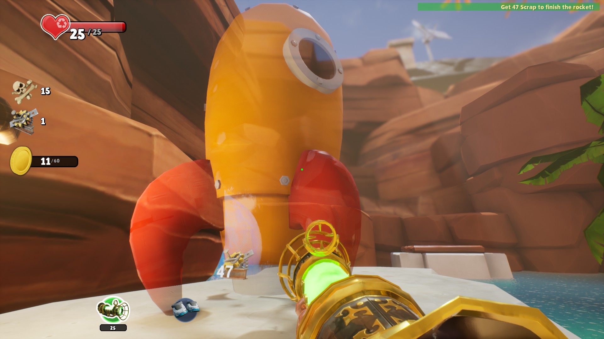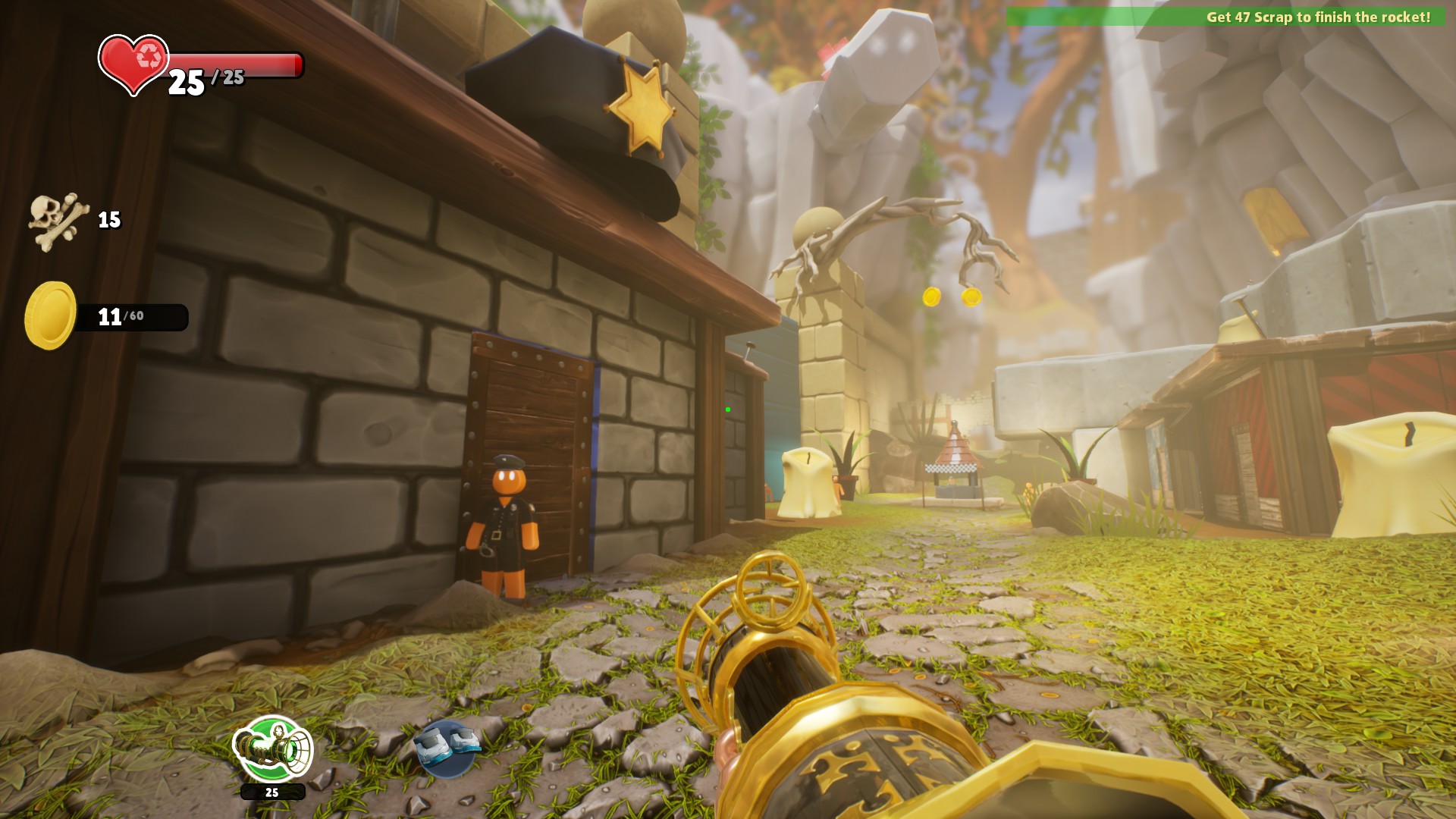Supraland‘s Crash DLC starts with the Red Prince setting foot in a little rocket. As he’s a toy, we see said rocket being carried around by the child who built the game’s literal sandbox. But the rocket, as you’ll no doubt be shocked to find out, crashes. Our hero lands outside the town of Orangeburg, which is home to all orange toys (although there is no mention of the rightfully-incarcerated orange prisoner you meet in the base game).