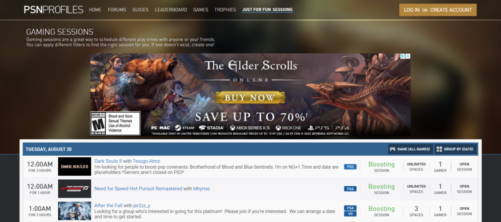 For those who don’t know, boosting is when you collaborate with a friend, or friends/group of gamers online to help each other earn multiplayer trophies that would be much harder to earn naturally. Is it cheating? Yes. Does it really matter? No. While you should definitely try your best to legitimately earn online trophies without resorting to boosting, with occasions of pending server closures, or instances of older games with smaller player bases being unplayable otherwise, there is sometimes no other choice than to find other trophy hunters online to help you earn missing multiplayer achievements. While there are a variety of useful boosting sources, PSNProfiles seems to be the best with its accessible user interface in the “Gaming Sessions” section of its website.