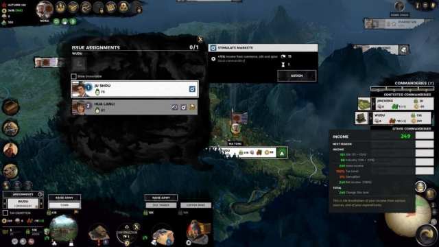 I mentioned earlier that you want a few strategist officers in your court. Not only are their fire arrows useful (if already unlocked), but they provide commerce, silk, and spice income via assignments or administrative positions. Since you’ve got a defensible position straddling the Silk Road, and two cities Wu Du and Hanzhong (captured from a warlord) which have silk trader buildings, commerce is the primary income-generator you’ll focus on, followed by industry later as you expand.